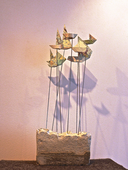 Roth Ob zur "kleinen Kieler Woche", zum "Bathroom's Cup" oder "auf dem Weg Richtung Süden" ... Wilma Roth's Boote, Kraniche und andere Objekte aus Papieren und Pappmachè haben alle klare Ziele. Sie fliegen, gleiten und segeln auf dünnen, hohen Edelstahlstäben, in festen Betonsockeln gehalten und trotzdem scheinbar in Bewegung. Denn der Weg ist das Ziel. Rainer