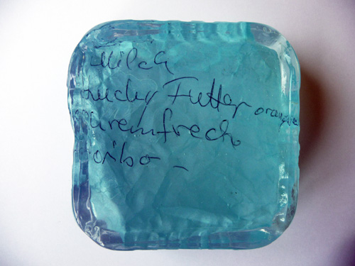 Kerstin Lochner "Es ist wahr, dass wir nicht schätzen, was wir haben, bis wir es verlieren, aber es ist auch wahr, dass wir nicht wissen, was wir vermissen, bis es uns begegnet!" Achtlos weggeworfene Einkaufszettel, vielleicht auch auf dem Parkplatz verlorene, sind der Ausgangspunkt für Kerstin Lochners ungewöhnliche und spannende Objekte. Eingegossen in Gießharz und für immer in "handelsüblichen" Formen konserviert, offenbaren sie Einblicke in alltägliche, menschliche Bedürfnisse und lassen uns Raum für die spannenden Geschichten dahinter.