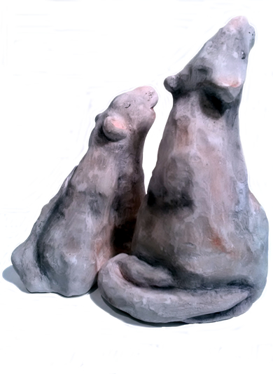 Wilma Roth arbeitet mit Pappmaché, Beton und Ton und kombiniert ihre Arbeiten gern mit Textilem und allem was sich so im Alltag finden lässt. In ihren originellen Arbeiten konzentriert sie sich auf die Bewohner von "Haus und Hof". Frech modellierte, charaktervolle Frauen und Männer in der Lebensmitte entspannen sich in Saucieren und Schöpflöffeln; menschliche und tierische Familienmitglieder finden sich in verschiedenen "Tierhaltungen" zusammen. Ihre Hühner aus grobem Pappmaché tragen stolz maßgefertigte Pullunder und Westen. Und auch ein paar neugierige Hausmäuse und Hofratten bereichern die Ausstellung. |