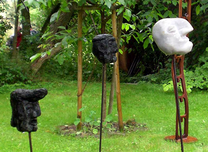 freundlich nickende Charakterköpfe aus Stein auf Stahlstangen